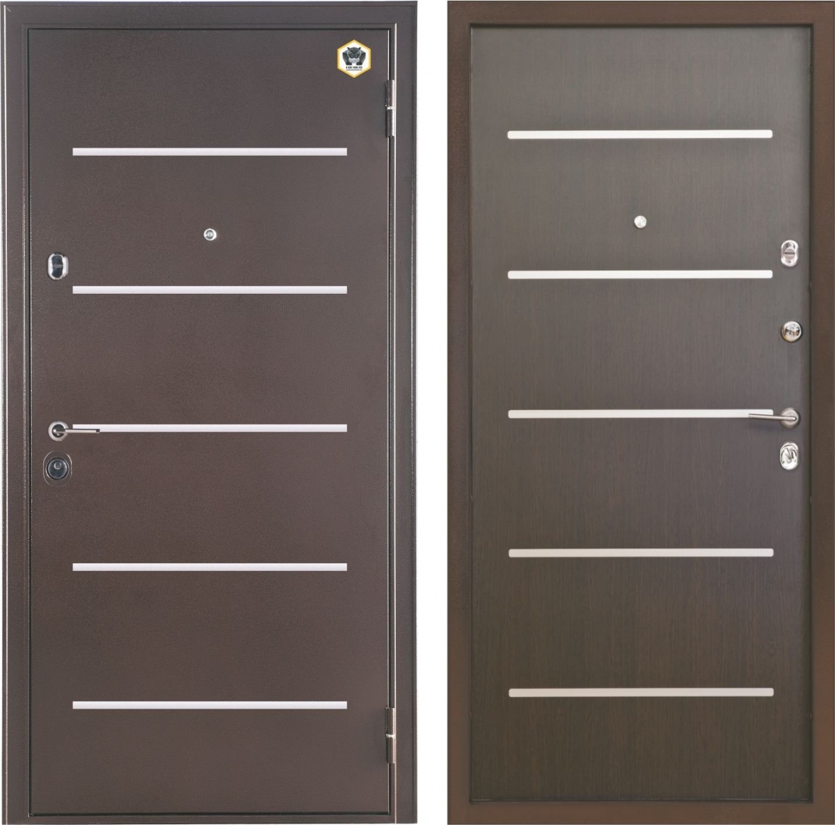 Входная дверь «Бульдорс Laser-24» – это сочетание надежности, практичности и стильного дизайна. Внешняя часть ее полотна отделана стальным листом, покрытым полимерной порошковой краской с антивандальными свойствами. Внутренняя поверхность двери представляет собой МДФ толщиной 10 мм с виниловым верхним слоем, имитирующим древесину ценных пород (цвет "Венге"). С обеих сторон полотно украшено параллельными полосами из светлого композита.