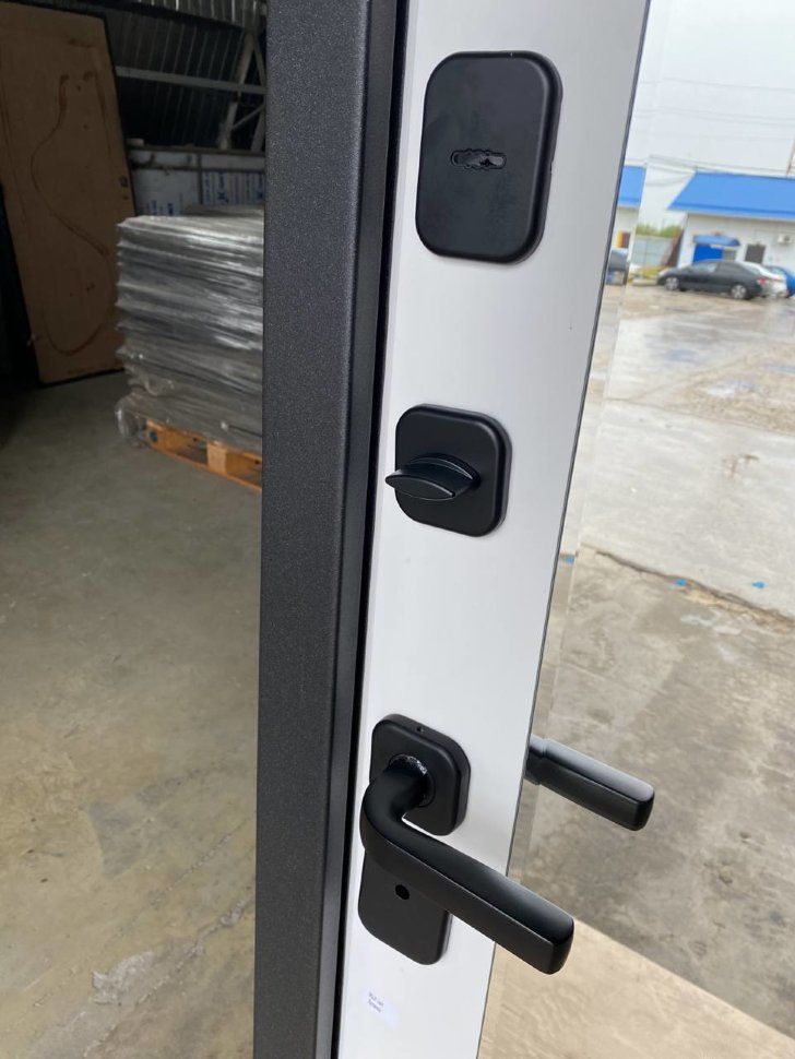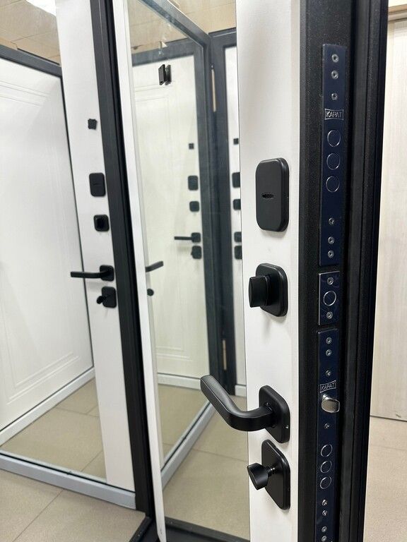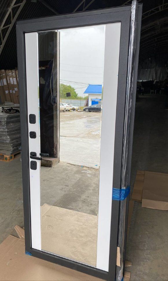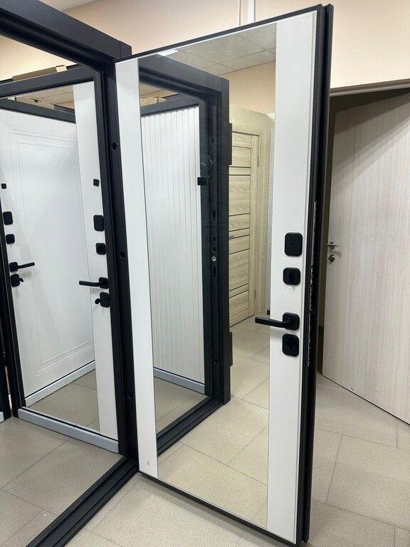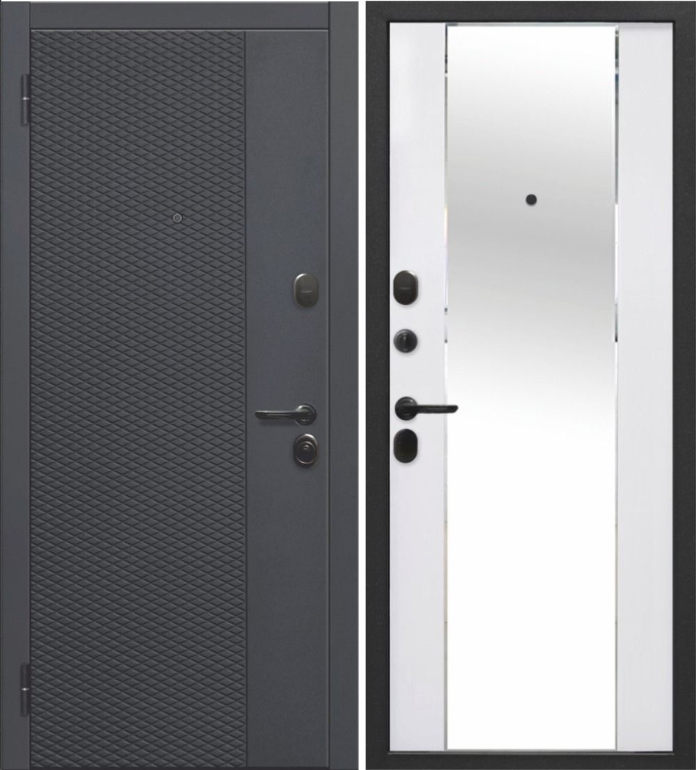 Входная дверь 7,5 см Флорида черный кварц - фрезерованная МДФ панель, цвет - эмалит белый, накладное зеркало с фацетом с защитной плёнкой — купить в Тюмени по цене 27 900 руб. — RosDoor (Сталь-сервис)