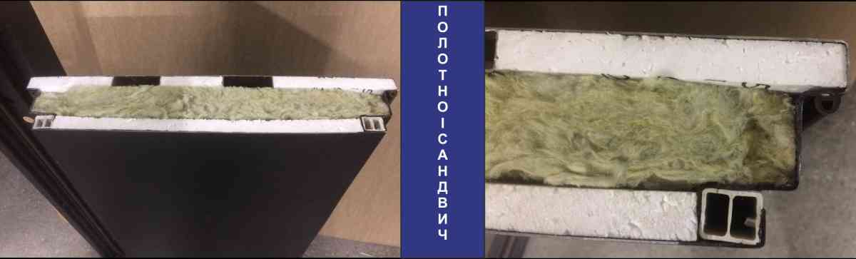 Дверное полотно толщиной 100 мм заполняется материалами с низкой теплопроводностью. Пенополистирол + минеральная плита + пенополистирол образуют сэндвич с низкой теплопроводностью и высокими показателями шумоизоляции.